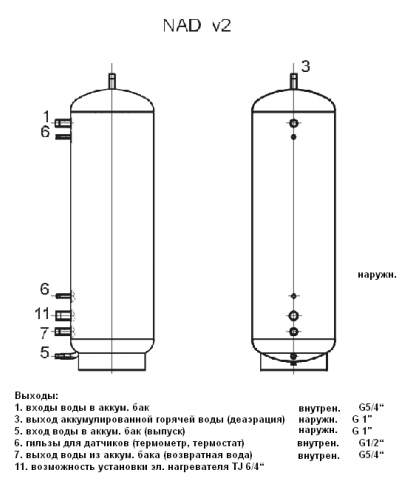 Аккумулирующие баки NAD v2 патрубковые выпускаются с учётом возможности установки патрубков G 1½“. Патрубок G 1½“ можно использовать для установки электрического нагревательного элемента TJ 6/4“. Возможно выпускать баки и с большим количеством патрубков. По заказу покупателя размещение патрубков и их количество можно изменить.