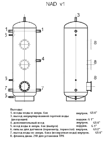 Аккумулирующий бак NAD 250 v1 с возможностью установки одного-трех фланцев. Фланец с межцентровым расстоянием болтов 210 мм может использоваться для монтажа встроенного электрического нагревателя фланцевого ТРК. В стандартном исполнении фланец заглушен. Поставляется с изоляцией толщиной 100 мм.
