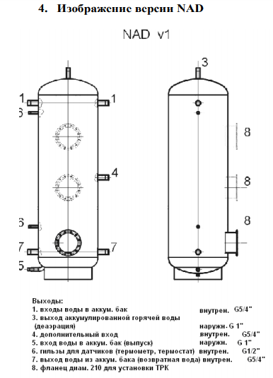 Аккумулирующий бак NAD 750 v1 с возможностью установки одного-трех фланцев. Фланец с межцентровым расстоянием болтов 210 мм может использоваться для монтажа встроенного электрического нагревателя фланцевого ТРК. В стандартном исполнении фланец заглушен. Поставляется с изоляцией толщиной 100 мм.