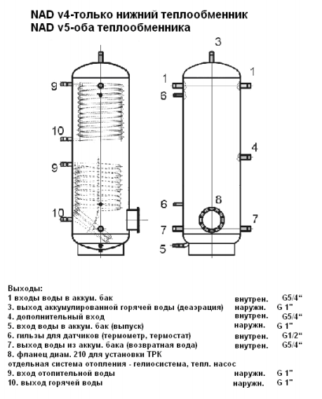 Аккумулирующий бак NAD 750 v5 с фланцем с межцентровым расстоянием болтов 210 мм для установки встроенного электрического нагревателя фланцевого ТРК и двумя теплообменниками, площадью 1,5 м2 каждый, для подключения дополнительной системы отопления (напр., SOLAR). В стандартном исполнении фланец заглушен. Поставляется с изоляцией толщиной 100 мм.