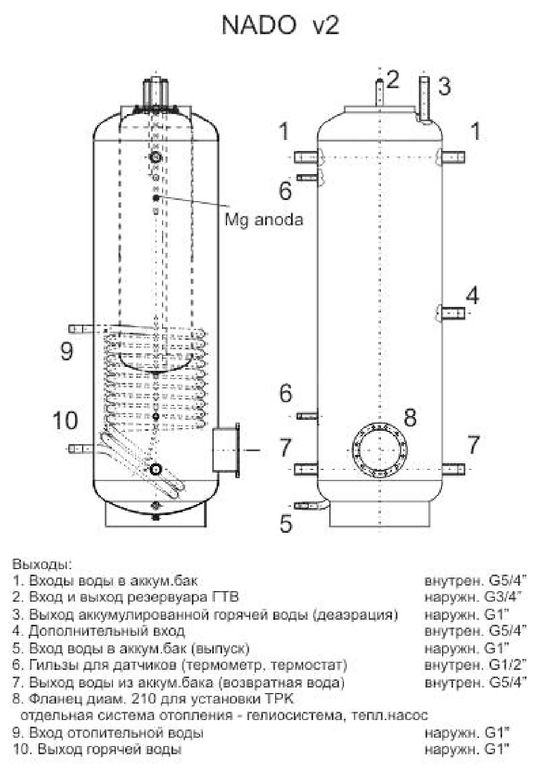 Тип NADO предоставляет возможность прямого нагрева технической воды (ГТВ) во внутренней эмалированной емкости или ее подогрева для следующего водонагревателя. Подключение к котлу в большинстве случаев дает возможность прямого нагрева технической воды во внутренней емкости до нужной температуры; при подключении же к солнечным коллекторам или тепловому насосу техническая вода только подогревается, и требуется подключение другого водонагревателя, например, электрического, который нагреет воду до нужной температуры, либо монтаж в аккумулирующем баке устройства дополнительного нагрева, например, электрического нагревателя TJ 6/4“ или нагревательного фланца ТРК.