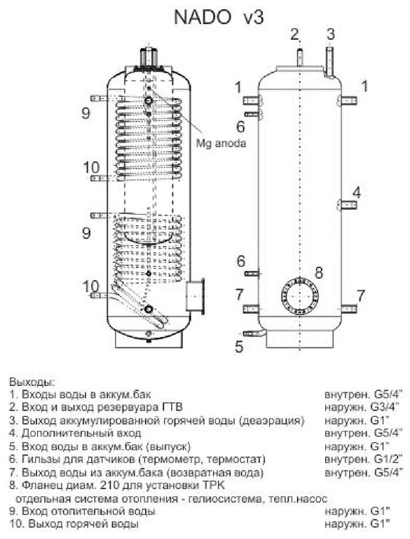 Тип NADO предоставляет возможность прямого нагрева технической воды (ГТВ) во внутренней эмалированной емкости или ее подогрева для следующего водонагревателя. Подключение к котлу в большинстве случаев дает возможность прямого нагрева технической воды во внутренней емкости до нужной температуры; при подключении же к солнечным коллекторам или тепловому насосу техническая вода только подогревается, и требуется подключение другого водонагревателя, например, электрического, который нагреет воду до нужной температуры, либо монтаж в аккумулирующем баке устройства дополнительного нагрева, например, электрического нагревателя TJ 6/4“ или нагревательного фланца ТРК.