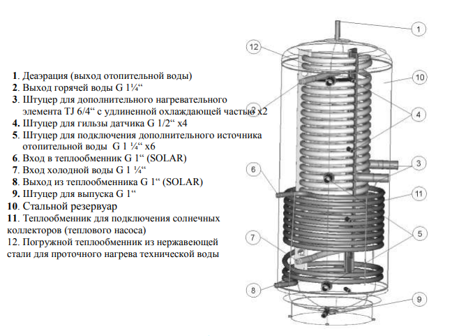 Змеевик размещен по всей высоте бака при помощи трех вертикальных опор. Подключение к системе ГВС производится при помощи патрубков 5/4".