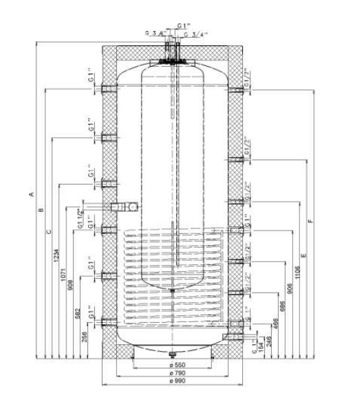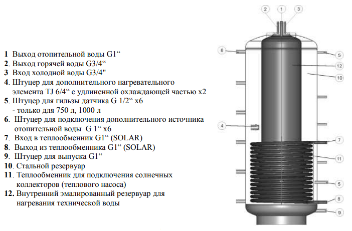 Трубчатый теплообменник змеевикового типа для подключения дополнительного источника тепла: гелиоконтура или теплового насоса. Диаметр подключений – 1".