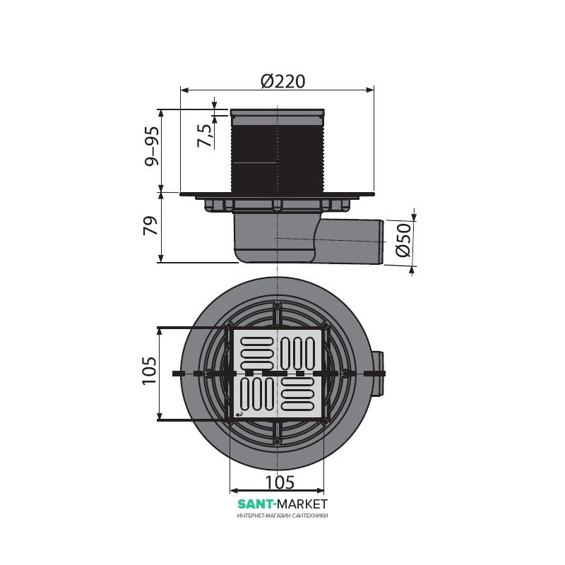 Cливной трап для душа AlcaPlast мокрый затвор боковой выпуск 105х105 регулируемый APV101
