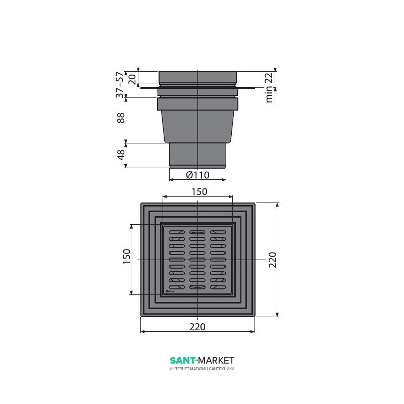 Cливной трап для душа AlcaPlast мокрый затвор прямой выпуск 150х150 APV11