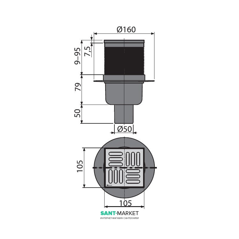 Cливной трап AlcaPlast для душа мокрый гидрозатвор прямой выпуск 105х105 APV2