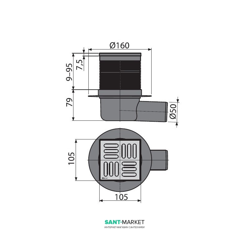 Трап для подвальных помещений AlcaPlast комбинированный сухой боковой выпуск 105х105 APV31