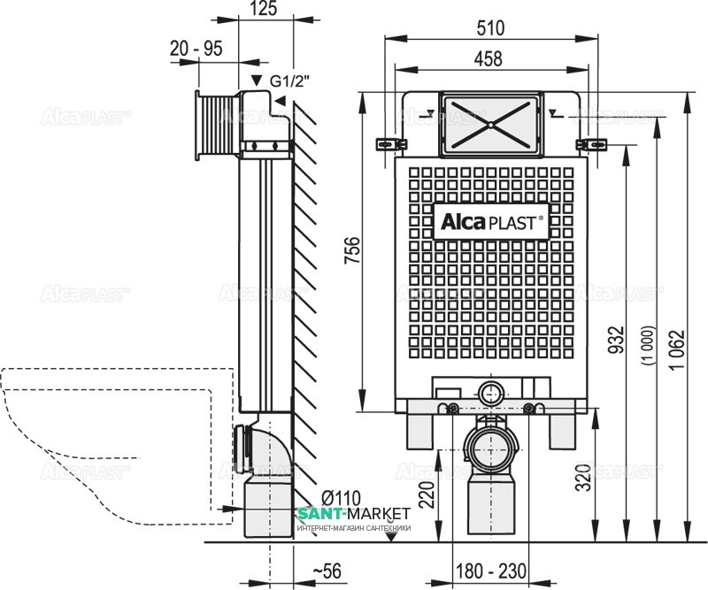 Система инсталляции для подвесного унитазa AlcaPlast Alcamodul 51х106х12 A100/1000