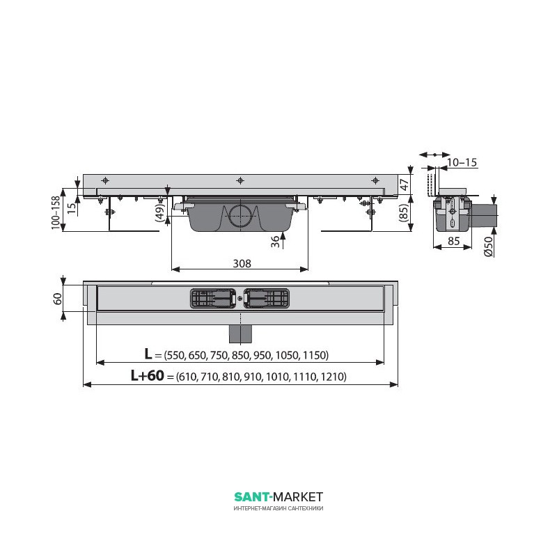 Желоб водосточный AlcaPlast боковой выпуск комбинированный затвор регулируемая высота APZ4-950