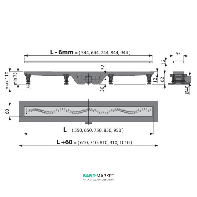 Желоб водосточный AlcaPlast боковой выпуск комбинированный затвор регулируемая высота APZ9-750