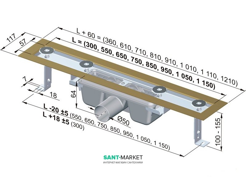 Водоотводящий желоб для душевой кабины или бокса. Используется в комплекте с решёткой Design. Решётка представляет собой цельный массив нержавеющей стали, с закругленными краями. Слив воды происходит между плиткой и решёткой, без использования перфорации. Цена решётки входит в стоимость комплекта. Установку можно производить как на открытых участках боксов и кабин, так и вблизи стен, перегородок, а также любых конструкций.