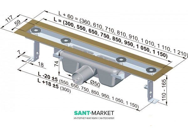 Желоб не имеет порогов и предназначен для установки в местах, с твёрдым покрытием пола (плитка, кафель). Вода будет проходить между плиткой и железными бортами решётки, с установленной внутрь плиткой. Наличие на верхней стороне сливного блока выкручивающихся упорных шайб помогает точно отрегулировать высоту внутренней плитки относительно внешней.