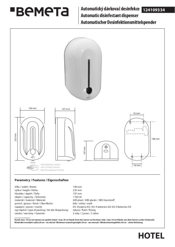 Автоматический дозатор для дезинфицирующего средства Bemeta Hotel 1100 мл пластик белый глянцевый