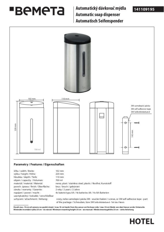 Автоматический дозатор для жидкого мыла Bemeta Hotel 700 мл нержавеющая сталь матовая 141109195