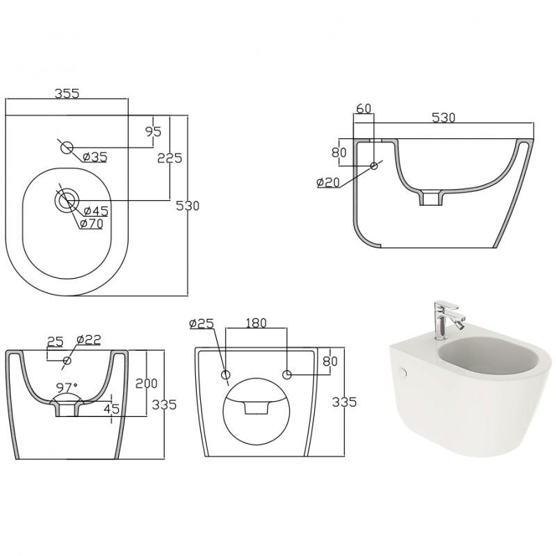 1) Биде подвесное Devit Laguna 35.5х53 см санфаянс белый