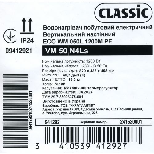 Бойлер Atlantic Classic Eco VM 50 N4Ls 1200W мокрый ТЭН белый 941292