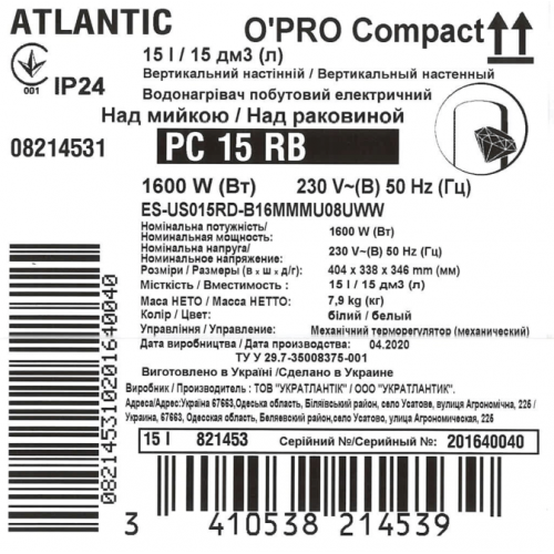 Бойлер Atlantic O'Pro Compact PC 15 RB 1600W мокрый ТЭН белый 821453