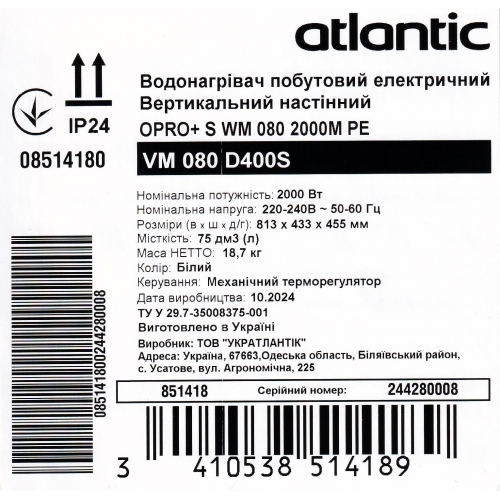 Бойлер Atlantic O'Pro+ VM 080 D400S 2000W мокрый ТЭН белый 851418