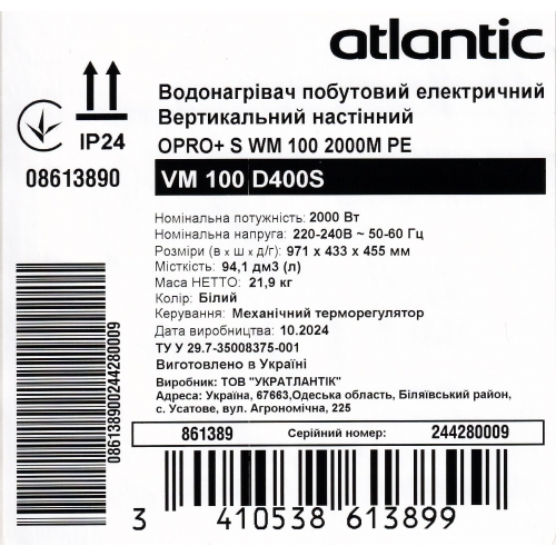 Бойлер Atlantic O'Pro+ VM 100 D400S 2000W мокрый ТЭН белый 861389