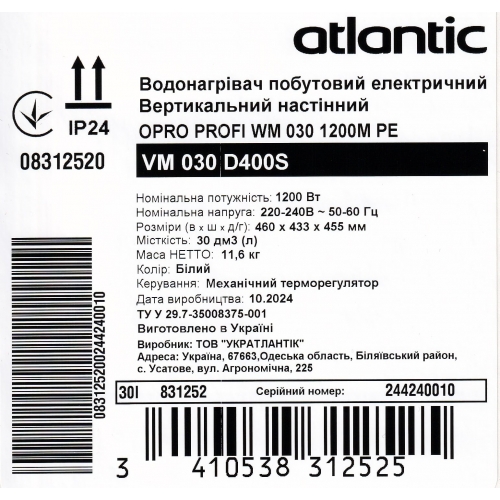 Бойлер Atlantic Opro Profi VM 030 D400S 1200W мокрый ТЭН белый 831252