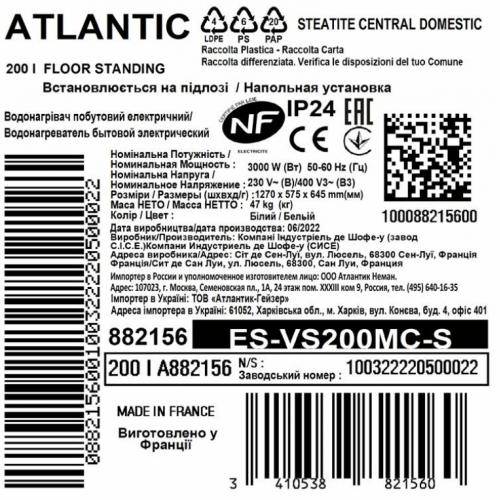 Бойлер Atlantic Steatite Central Domestic Floor Standing 200 ES-VS200MC 3000W сухой ТЭН белый 882156