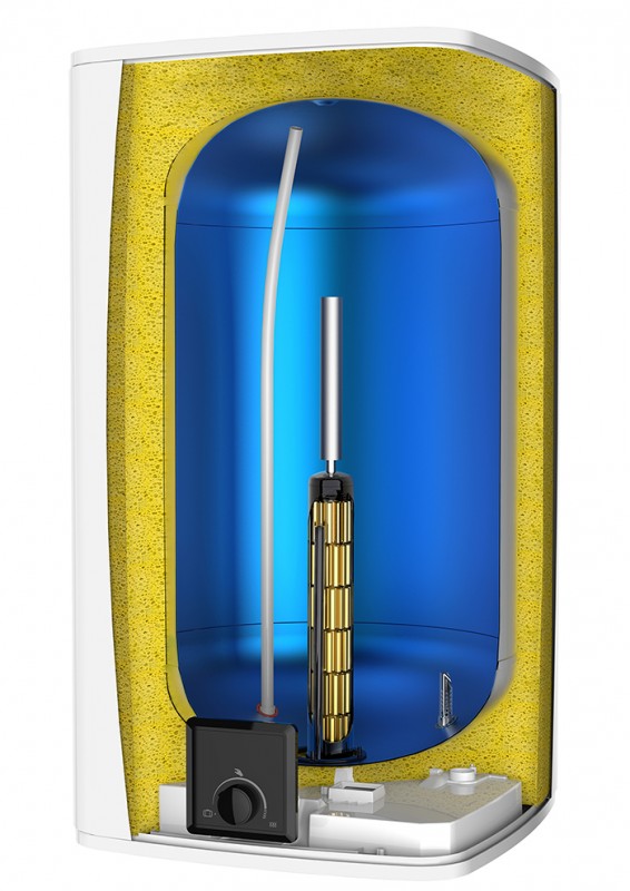 Водонагреватель имеет форму призмы и может быть установлен в любом интерьере. Такой бойлер можно купить для семьи из 3 человек. Способ установки — вертикальный. Изменилась высота прибора из 790 мм до 712 мм. Это позволяет установить его даже в небольшом шкафу.