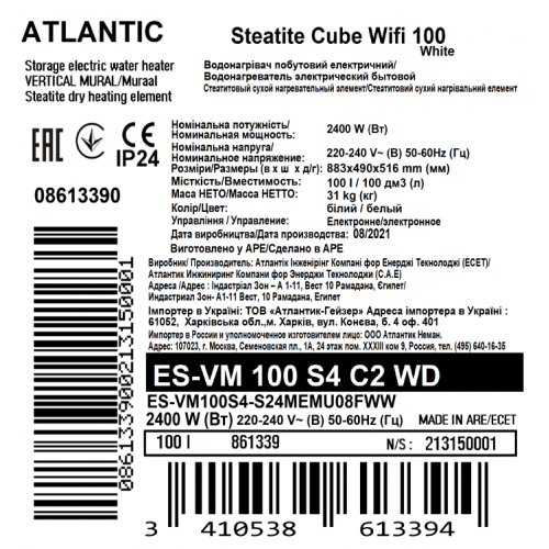 Atlantic Steatite Cube WI-FI ES-VM 100 S4 C2 WD (2400W) – бытовой электроводонагреватель белого цвета премиальной серии французского производителя Atlantic, с функцией управления через Wi-Fi.
