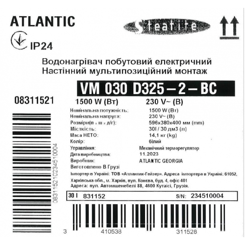 Бойлер Atlantic Steatite Slim VM 030 D325-2-BC 1500W сухой ТЭН белый 8311521