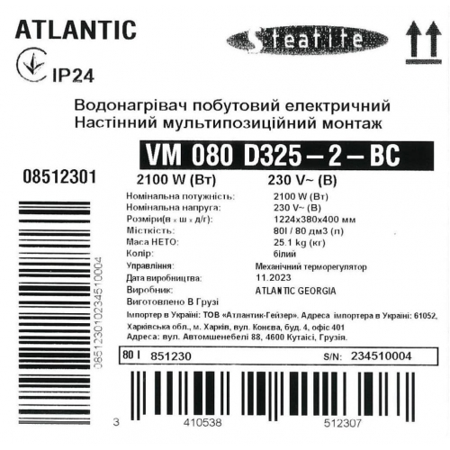 Бойлер Atlantic Steatite Slim VM 080 D325-2-BC 2100W сухой ТЭН белый 8512301