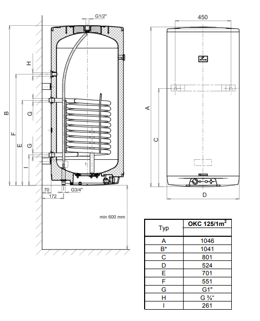 1) Бойлер комбинированного нагрева Drazice OKC 125/1m2 навесной вертикальный