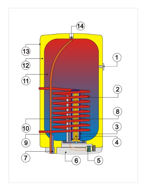 - Теплообменником. Водонагреватель можно подсоединить к внешней теплосистеме с максимальной температурой 110 °C и давлением 10 Бар. Производительность теплообменника водонагревателя регулируется в зависимости от мощности внешнего источника тепла. Теплообменник работает либо в режиме принудительной циркуляции либо в режиме безнапорного накопления. Датчик контроля горячей воды установлен в той же гильзе, что и электродатчики.