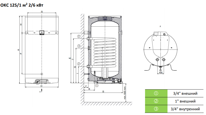 1) Бойлер комбинированного нагрева Drazice OKC 125/1m2 2-6 кВт навесной вертикальный