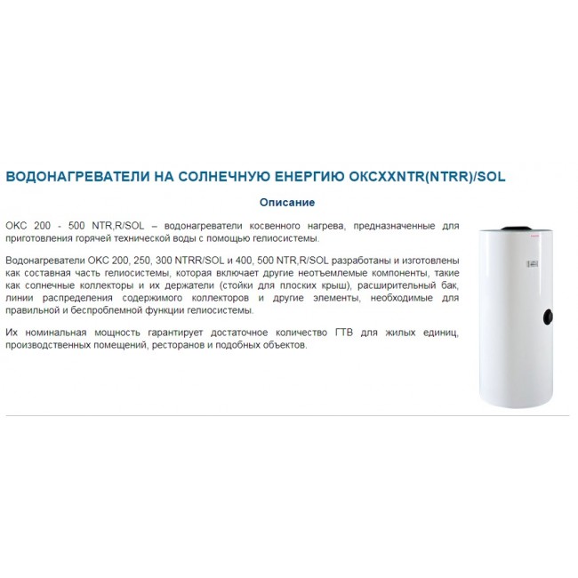 Бойлеры Drazice NTR(R)/SOL косвенного нагрева, предназначенные для приготовления горячей воды от гелиосистемы. Водонагреватель OKC 200, 250, 300 NTRR/SOL и 400, 500 NTRR/SOL разработаны и изготовлены как составная часть гелиосистемы, которая включает другие неотъемлемые компоненты, такие как солнечные коллекторы и их держатели (стойки для плоских крыш), расширительный бак, линии распределения содержимого коллекторов и другие элементы, необходимые для правильной и беспроблемной работы гелиосистемы. Приготовление ГВС (нагрев от теплоносителя системы отопления / гелиосистемы).