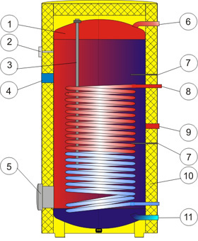 Резервуар водонагревателя сварен из стального листа и полностью защищен эмалью, устойчивой к воздействию горячей воды. В качестве дополнительной антикоррозионной защиты в резервуаре установлен магниевый анод, который регулирует электрический потенциал внутренней части емкости и таким образом уменьшает действие коррозии.