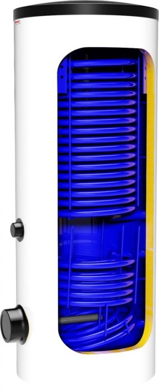С двумя теплообменниками, верхний большой теплообменник для подключения источников тепла (тепловой насос, низкотемпературный источник) и нижний теплообменник (например, солнечный).