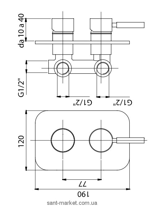 Основой представленного смесителя является тонкая полированная пластина прямоугольной формы, высотой 19 сантиметров и шириной 12 сантиметров, с закругленными углами. В нижней ее части посередине расположена невысокая цилиндрическая ручка для регулировки подачи холодной и горячей воды, снабженная небольшим рычагом вытянутой цилиндрической формы, направленным строго вниз. Чуть выше над ней располагается еще одна аналогичная цилиндрическая ручка, но без рычага. Ее основное назначение – переключение потоков воды. Данная модель разработана для переключения потоков воды на три выхода. В зависимости от оборудования ванной комнаты это может быть еще одна душевая ручка, верхний душ, кран или любой другой элемент с подводом воды.