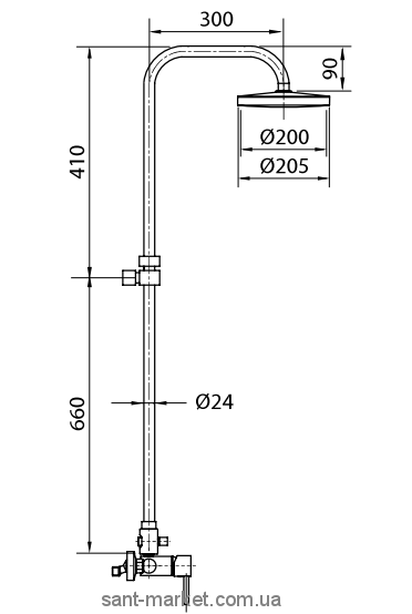 Конструкция представленного смесителя включает в себя основание в форме правильного цилиндра, расположенного горизонтально и устанавливаемого на стену с помощью двух надежных дисковидных крепежей в тыльной части. Спереди в центральную часть основания врезается крупная цилиндрическая ручка для регулировки подачи горячей и холодной воды, оборудованная вытянутым цилиндрически рычагом, направленным вниз. Выход на душевую колонну расположен в верхней части смесителя в месте пересечения ручки с основанием. При этом душевая колонна, сделанная из трубы диметром 2,4 см, по форме напоминает высокую букву «Г» с несколько сглаженными углами, где вертикальная часть равна 107 сантиметрам, а горизонтальная – 30 сантиметрам. В ее начале с правой стороны находится цилиндрический переключатель с ручного на верхний душ, а с левой – выход на шланг к душу. На высоте 66 сантиметров от начала колонны она прикрепляется к стене с помощью цилиндрического крепежа, соединенного в боковой части колонны с держателем для ручного душа в форме стержня с кольцом-ложем. В него ставится ручной душ вытянутой цилиндрической формы с отверстиями для подачи воды в верхней боковой части ручки. Загнутое вниз окончание душевой колонны украшает крупная лейка верхнего душа диаметром 20,5 сантиметров, плоскость которой смотрит строго вниз, без наклона.