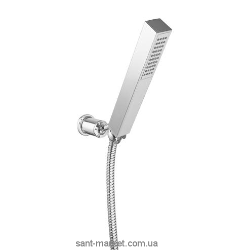 Комплект данного душевого гарнитура включает в себя современный ручной душ, выполненный в форме вытянутого прямоугольного параллелограмма с квадратным сечением. Отверстия для подачи воды, выстроенные ровными рядами, находятся в верхней части обращенной вниз стороны и занимают чуть меньше ее половины. В комплект изделия, помимо шланга, также входит держатель для ручного душа, выполненный в форме снабженного дисковидным основанием цилиндра, в вершину которого встроен шаровой шарнир с обращенным вверх стержнем, заканчивающимся широким кольцевидным ложем для ручного душа.