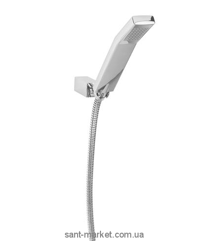 ПроЦентральным элементом предлагаемого душевого гарнитура является плоский ручной душ, имеющий форму вытянутого прямоугольника, согнутого в последней трети под небольшим углом. Отверстия для подачи воды располагаются ровными рядами на нижней поверхности ручки в согнутой ее части. Разъем для подключения шланга находится в нижнем торце ручки по центру. Оставшимися элементами комплекта являются шланг и настенный держатель для душа в форме прямоугольного параллелограмма с квадратным сечением. В вершину держателя вмонтирован шаровой шарнир с коротким, направленным вверх стержнем, снабженным на конце широким кольцевидным ложем для ручного душа, направленным под углом вниз.