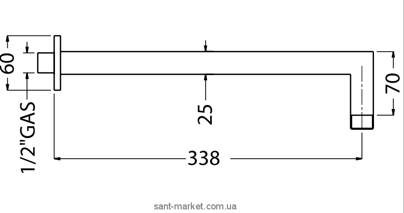 По форме представленное изделие напоминает горизонтально расположенную букву «Г», с длиной основания ок. 34 сантиметров и длиной «носика» 7 сантиметров, сделанную из трубы квадратного сечения со стороной 2,5 сантиметра. Часть кронштейна, монтируемая в стену, оборудована резьбой формата G 1/2" для подвода воды и скрывается за тонким крепежом квадратной формы со стороной 6 сантиметров. Резьбовое соединение для верхней душевой лейки находится на нижней поверхности смотрящего отвесно вниз носика кронштейна.