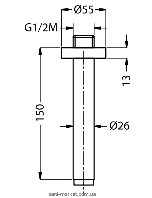 Конструкция данного аксессуара исключительна проста. Она включает в себя прямую трубу длиной 15 сантиметров и диаметром 2,6 сантиметра, передняя часть которой предназначена для соединения с верхней душевой лейкой, а задняя часть, снабженная дисковидным крепежом толщиной 1,3 см и диаметром 5,5 см, – для подключения труб водоснабжения посредством резьбового соединения G 3/4".