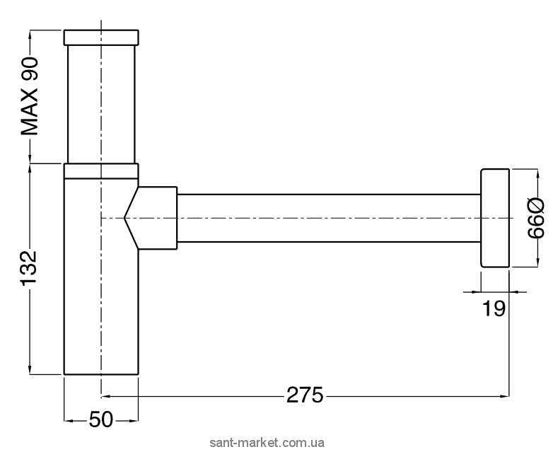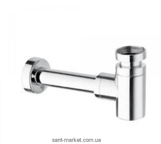 Основанием представленной модели выступают два вставляющихся друг в друга цилиндра. Тот из них, который расположен снизу, имеет больший диаметр – 5 сантиметров и высоту 13,2 сантиметра. Высота же верхнего цилиндра, посредством которого сифон соединяется со сливным отверстием биде, может достигать 9 сантиметров. От верхней боковой части более крупного цилиндра под прямым углом ответвляется короткий цилиндрический элемент, в который устанавливается круглая труба водоотвода общей длиной около 27 сантиметров. К стене она подсоединяется посредством дисковидного элемента диаметром 6,6 сантиметра и толщиной 1,9 сантиметра