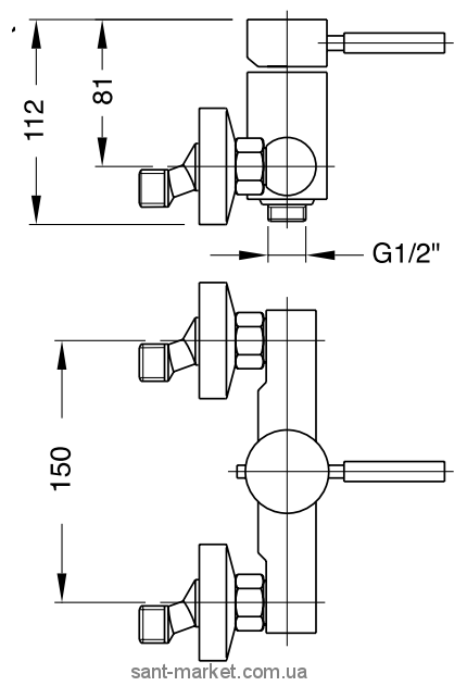 Представленный смеситель для душа имеет правильную крестовидную конструкцию. Вертикальная ее часть представляет собой цилиндр высотой 11,2 см, на вершине которого расположена цилиндрическая ручка одинакового с ним диаметра для регулирования напора горячей и холодной воды. К боковой поверхности ручки горизонтально вперед присоединен небольшой рычаг вытянутой цилиндрической формы. Выход на шланг к душу располагается на донной стороне вертикального элемента конструкции. Горизонтальную часть смесителя формирует цилиндр чуть меньшего диаметра, пронизывающий снизу вертикальную часть. С его тыльной стороны в противоположных концах расположены два дисковидных элемента, посредством которых смеситель прикрепляется к стене.