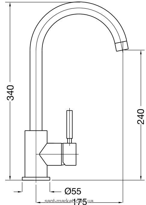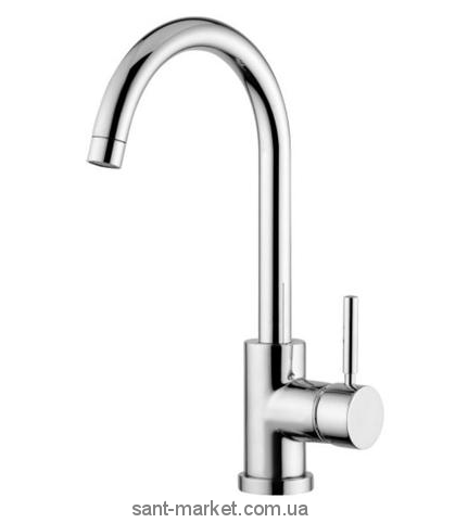 Данный смеситель в первую очередь выделяется своими размерами: его высота от основания до самой высокой точки крана составляет 34 см. Основание смесителя представляет собой средних размеров цилиндр, устанавливаемый на столешницу посредством дисковидного утолщения в нижней его части, диаметром 5,5 см. С правой стороны в центр основания горизонтально врезается небольшой цилиндрический элемент, увенчанный цилиндрической ручкой для регулирования напора холодной и горячей воды. В верхней части ручки к ней строго вертикально присоединен тонкий рычаг вытянутой цилиндрической формы. К верхней части основания смесителя крепится дуговидный кран строгого круглого сечения, выступающий вперед на 17,5 см. Его носик, прямо переходящий в сопло одинакового с ним диаметра, слегка наклонен относительно плоскости раковины.