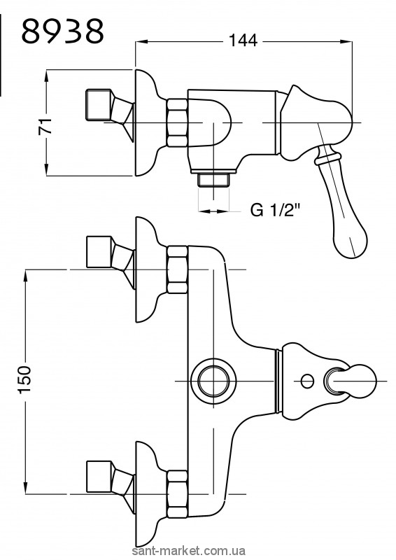 Представленный смеситель имеет плавные, закругленные формы. Его цельнолитая конструкция представляет собой сильно вытянутый, горизонтально расположенный эллипс длиной около 16 см, слегка расширяющийся к центру, где горизонтально вперед расположена оригинальная колоколоподобная ручка для регулировки напора горячей и холодной воды с большим, удобным рычагом вытянутой каплевидной формы, направленным вниз. Помимо стандартной комплектации ручка для регулировки напора воды может поставляться в кристаллическом оформлении. Под ручкой, в нижней центральной части смесителя, располагается выход на шланг к душу. В стену изделие монтируется посредством двух круглых тарелковидных крепежей диаметром 7,1 см. От стены смеситель выступает приблизительно на 15 см.