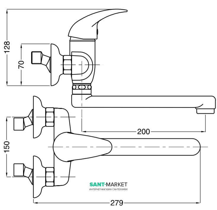 Горизонтальным основанием этой модели выступает трубковидный элемент в форме сильно вытянутого эллипса, в центр которого вертикально врезается крупный цилиндр, украшенный сверху округлой ручкой для регулировки подачи холодной и горячей воды, плавно переходящей в плоский изогнутый рычаг слегка выпуклой эргономичной формы, верхняя поверхность которого напоминает обтекаемый треугольник. Конструкция смесителя также включает в себя ровный широкий кран приплюснутой формы, который присоединяется к основанию снизу по центру. Он простирается вперед на 20 см, а его крупное и круглое сопло смотрит вертикально вниз. К стене смеситель крепится с помощью двух тарелковидных элементов диаметром 7 см, расположенных в с тыльной стороны горизонтального основания.