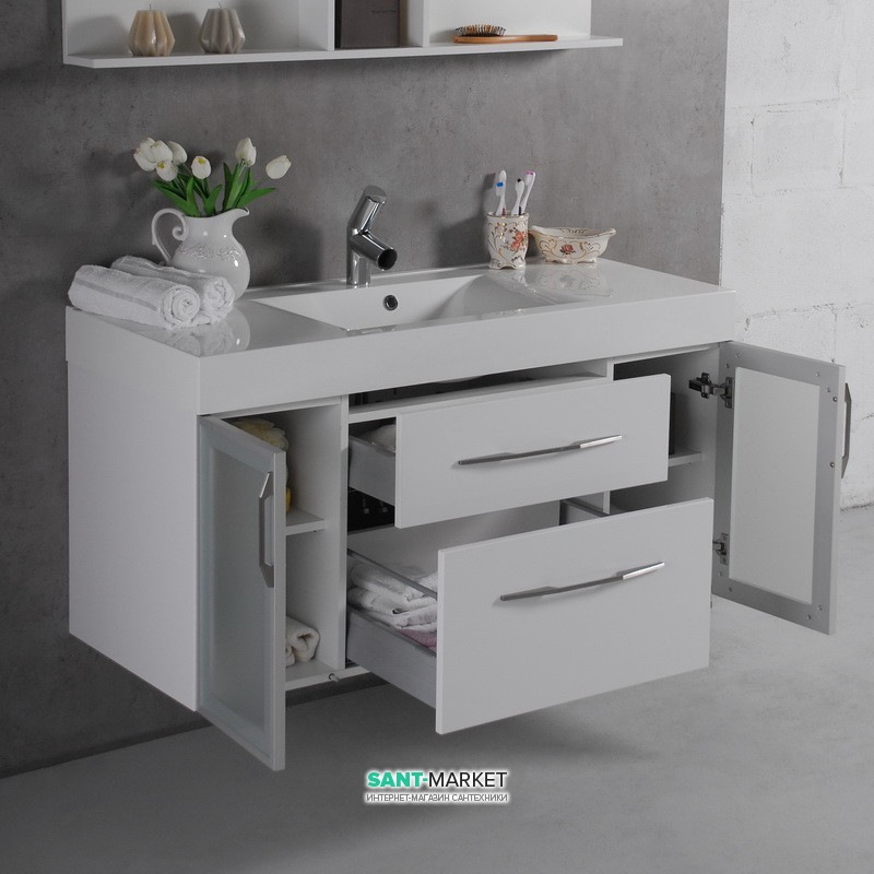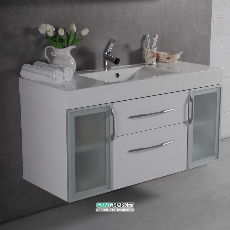 Данный комплект с подвесным шкафчиком длиной 120 см предназначен украсить интерьер большой ванной комнаты. Тумба выполнена в классической прямоугольной форме с двумя выдвижными ящиками на доводчиках и двумя распашными дверцами. Шкафчик укомплектован прямоугольным умывальником из искусственного камня с одной чашей длиной 60 см и двумя крыльями по 30 см на которых с легкостью можно разместить все необходимые средства по уходу за лицом.