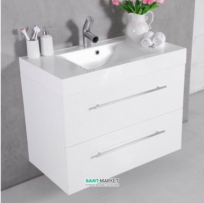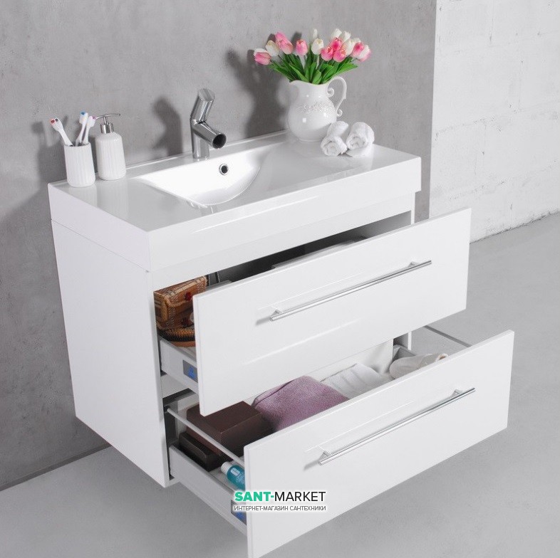 Подвесной шкафчик длиной 90 см выполнен в классической прямоугольной форме с двумя большими, выдвижными ящиками на доводчиках, в которых с легкостью можно разместить как полотенца так и средства по уходу за телом. Шкафчик укомплектован прямоугольным умывальником из искусственного камня с одной чашей длиной 60 см и двумя крыльями по 15 см на которых с легкостью можно разместить все необходимые средства по уходу за лицом.