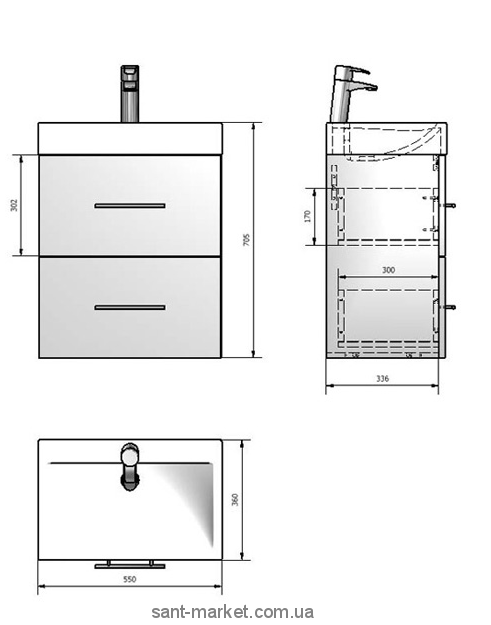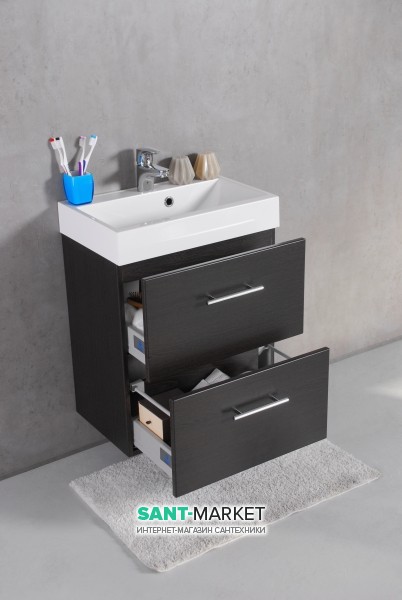 Навесной шкафчик с двумя выдвижными ящиками, без доводчиков, предназначен для небольшого санунзла или маленькой ванной комнаты. Корпус шкафчика и фасад изготовлен из плиты МДФ, которая покрыта виниловой пленкой стойкой к cтиранию. В данном комплекте шкафчика для ванной комнаты используется мебельная фурнитура ведущих европейских производителей "Hettich" и "Blum". Изделие предназначено для использования в ванной комнате и изготовлено из качественных влагостойких материалов. Шкафчик комплектуется умывальником из литого камня, модель умывальника UM-550.